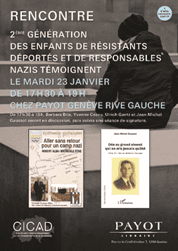 Mardi 23 janvier 2018, la CICAD organise à Genève en partenariat avec la librairie Payot, une discussion suivie d’une séance de dédicace de 17h à 19h30 en présence de 4 enfants de résistants déportés français et de responsables nazis.